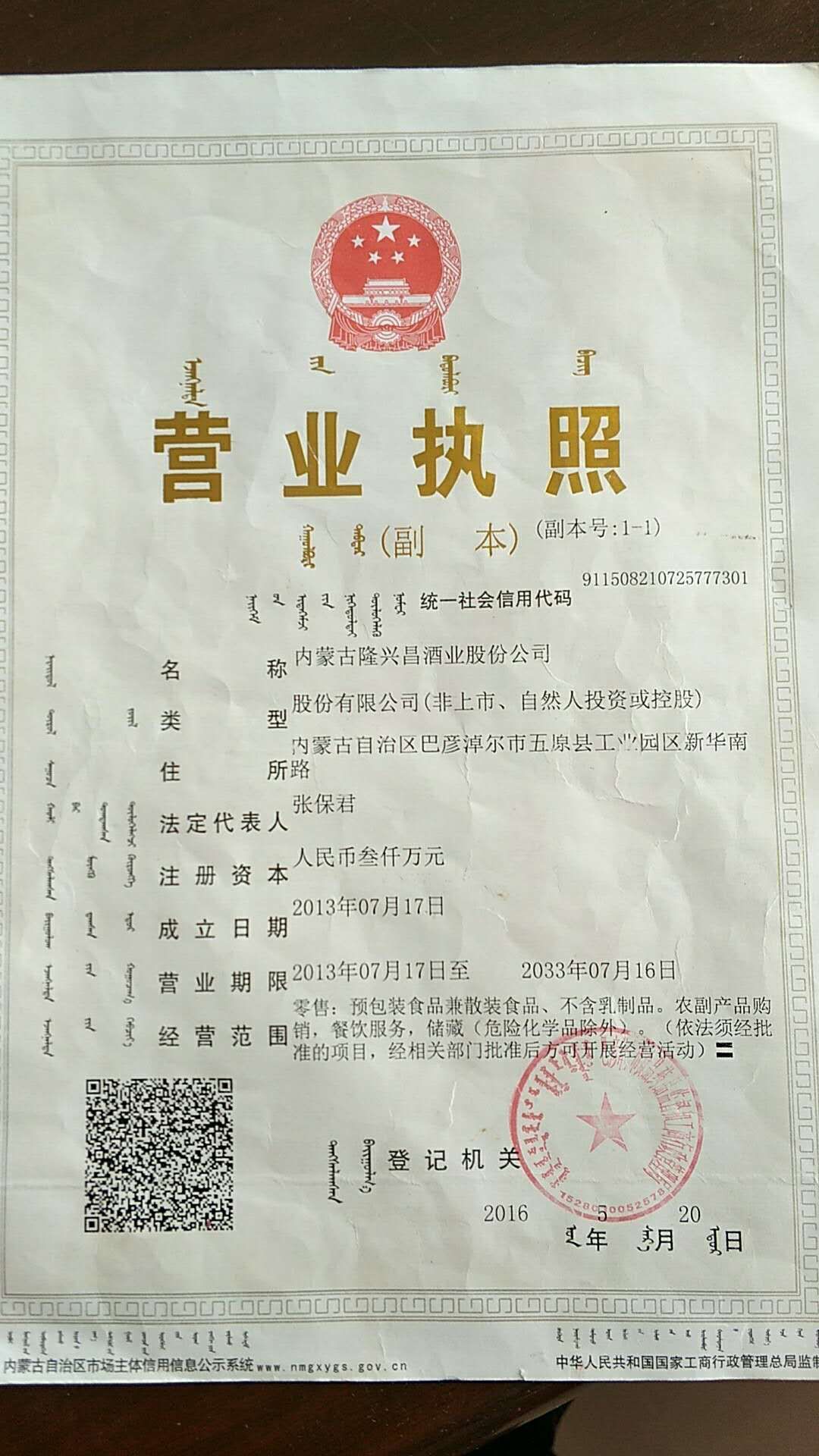 内蒙古隆兴昌酒业股份公司成立于2013年7月17日,公司位于内蒙古五原县工业园区,占地面积2万余平米,建筑面积1万2千多平米。公司以经销“隆兴昌”品牌系列白酒为主,同时,兼营茶叶,以及预包装食品兼散装食品和不含乳制食品。